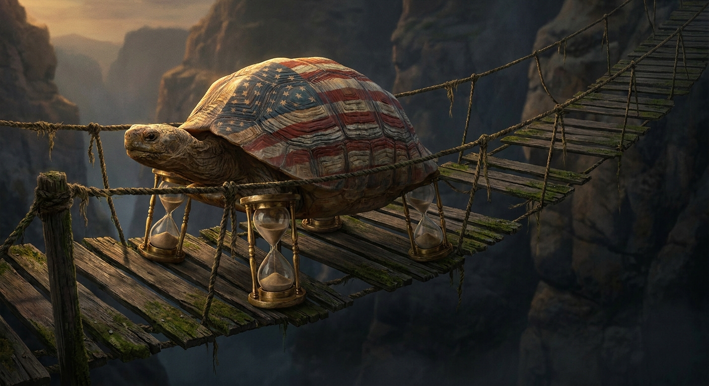 The economy is a tortoise crossing a rope bridge. It's moving. The hourglasses are running. Whether the bridge holds depends on variables that neither political side wants to acknowledge are outside their control: the duration of the Iran war, the trajectory of global food prices, the Fed's ability to hold the line on inflation without triggering a recession.